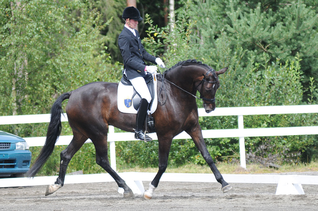 - En hoppe som er for stor, men den er fem år, så har vi valgt å kåre den i DH fordi vi tenker at den kunne ha gått størrelsesmessig som 3-åring ettersom den nok har vokst en del siden da. Det er en fantastisk hoppe, den er så praktfull, den er høystilt, storrammet. Feminin med passe edelhetsgrad. Den har et pent hode, en passende lang og velsansatt hals, lang, skrå skulder, lang og velmarkert manke, og det er ingen tvil om hvor salen skal ligge. Hun har en god og smidig overlinje, et langt og velformet og muskuløst kryss og god lårmuskulatur, litt rette og inntået forbein, men velformede hover. Smidig og rommelig bevegelser som er deilige og smidige. Den skritter igjennom i ryggen, travet og galoppen er noe man drømmer om å se hos en hest. Den har en balanse uten like og god albuefrihet. Vi har gitt 8 i skritt, 9 i trav og galopp.